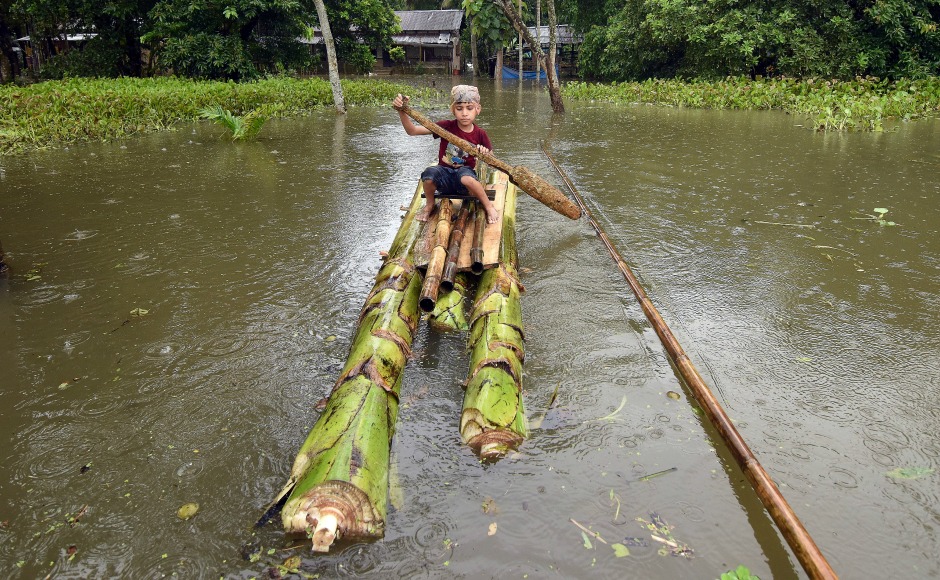 A boy rows a makeshift raft outside his submerged house in the flood-affected Kuthori village near Kaziranga National Park in Nagaon district of Assam. Over 66,516 hectares of agricultural land continue to be affected by floods, a report said. Reuters
