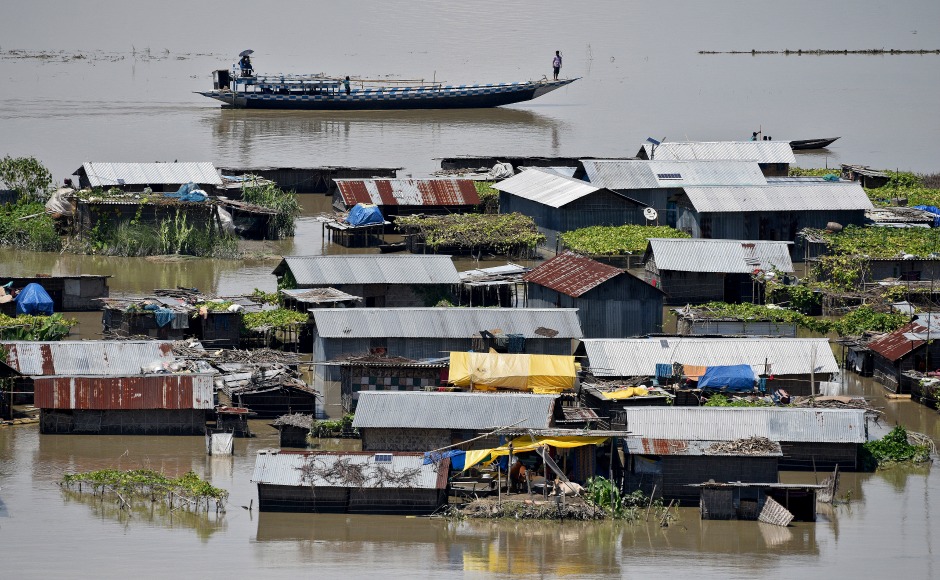 Villagers use a boat as they row past partially submerged houses at a flood-affected village in Morigaon. Due to impact of the flood, many roads, embankments and bridges have been damaged in several districts, including Lakhimpur, Biswanath, Goalpara, Bongaigaon, Dhubri, Golaghat, Majuli, Sivasagar and Karimganj. Reuters