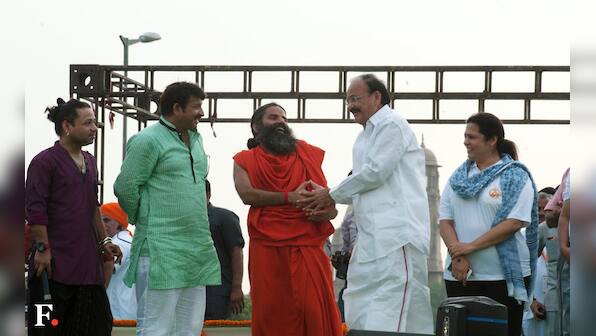 Ramdev shakes hands with Venkaiah Naidu at a massive yoga camp held at Rajpath in New Delhi on Sunday. Naresh Sharm/Firstpost
