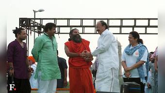 Ramdev shakes hands with Venkaiah Naidu at a massive yoga camp held at Rajpath in New Delhi on Sunday. Naresh Sharm/Firstpost