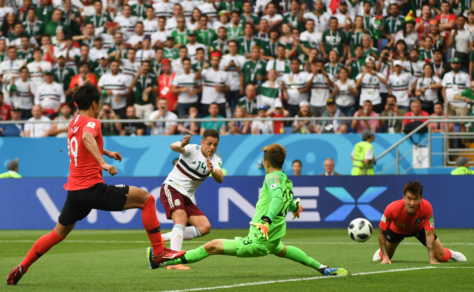 Javier Hernandez scored Mexico’s second goal in their match against South Korea. Mexico won 2-1, ensuring their qualification after beating defending champions Germany in their first match. AFP