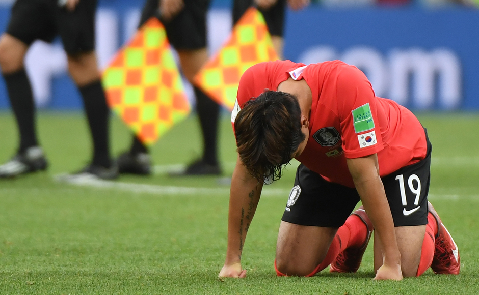 South Korea’s defender Kim Young-gwon reacts after the final whistle of their match against Mexico. South Korea’s chances of qualifying for the next round are minimal and require them to defeat Germany in their next match. AFP