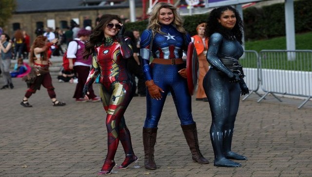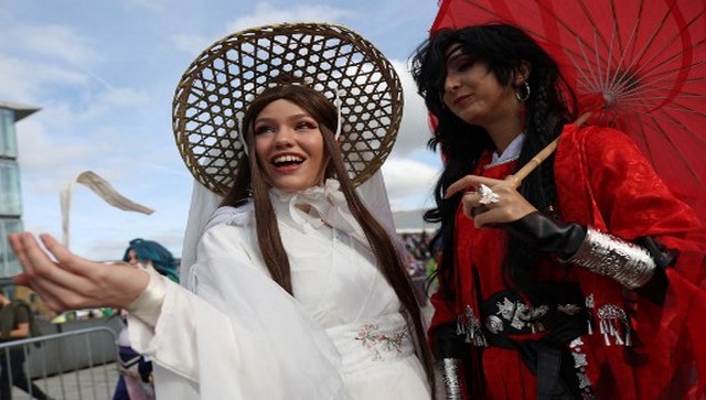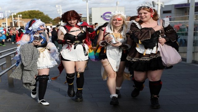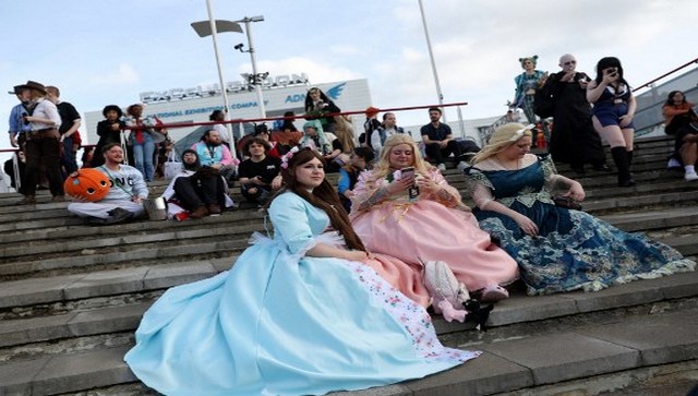 Women dressed in costumes arrive at MCM Comic Con in London. The event had a number of fun activities lined up for pop culture fans like celebrity panel discussions, meet and greets, gaming hubs and cosplay competitions. AFP