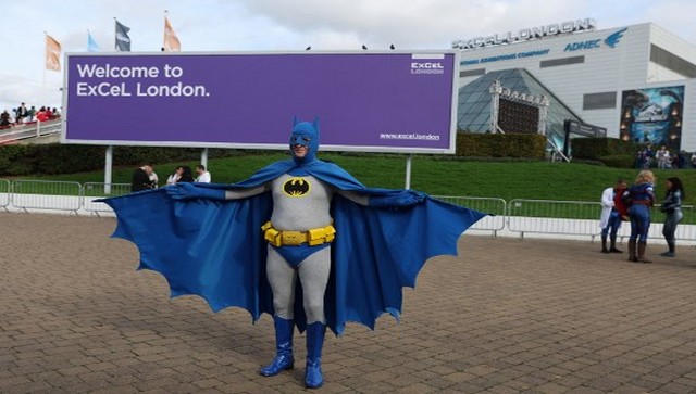 A cosplayer dressed as Batman poses for a photograph at London’s MCM Comic Con. AFP