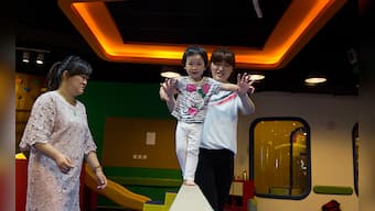 In a room full of bright-colored cubes and giant mattresses, giggling children climb bars, try somersaults and walk gingerly on a low balance beam. China is trying to rejig its sports training policy to attract parents and kids to participate in sports. AP