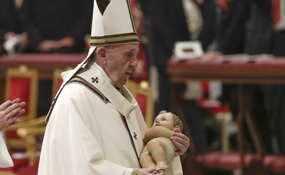 Pope Francis held a statue of Baby Jesus as he left after celebrating Christmas Eve Mass in St Peter’s Basilica at the Vatican. “Christmas reminds us that God continues to love us all, even the worst of us,” Francis, presiding at the seventh Christmas season of his pontificate, said in his sermon. AP