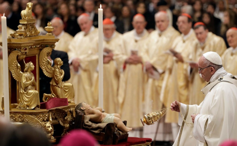 Pope Francis spreads incense in front of a statue of Baby Jesus during Christmas Eve Mass in St Peter’s Basilica at the Vatican on Monday. AP