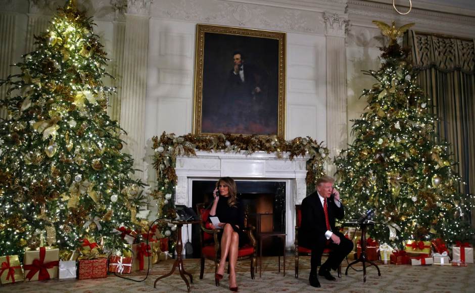 President Donald Trump and first lady Melania Trump speak on the phone sharing updates to track Santa’s movements from the North American Aerospace Defense Command (NORAD) Santa Tracker on Christmas Eve ON Monday. AP