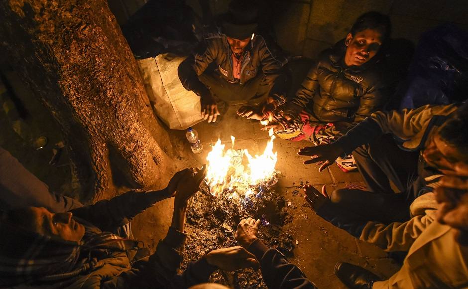 Delhi continued to reel under a severe cold wave on Sunday morning with the minimum temperature settling at 3.4 degrees Celsius, a notch above Saturday’s minimum temperature. Seen here are workers sitting by a bonfire on a chilly Saturday evening. PTI