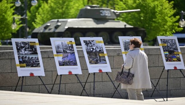 A visitor looks at pictures of the destruction of World War II and Russia’s war in Ukraine displayed at an exhibition at the Soviet War Memorial in Tiergarten in Berlin on 8 May, 2022 during commemorations to mark the 77th anniversary of the 1945 victory against Nazi Germany. AFP