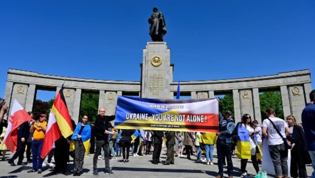 Activists display a banner reading ‘Ukraine - you are not alone’ at the Soviet War Memorial in Tiergarten in Berlin on 8 May, 2022 during commemorations to mark the 77th anniversary of the 1945 victory against Nazi Germany. AFP