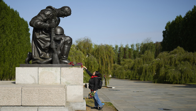 A woman lays down a flower as she arrives at a Soviet War Memorial to commemorate the end of World War II 77 years ago, at the district Treptow in Berlin, Germany, 8 May, 2022. AP