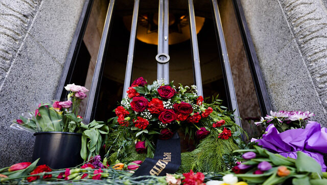 Flowers, to commemorate the end of World War II, 77 years ago, placed in front of the tomb of the Soviet War Memorial at the district Treptow in Berlin, Germany, 8 May, 2022. AP