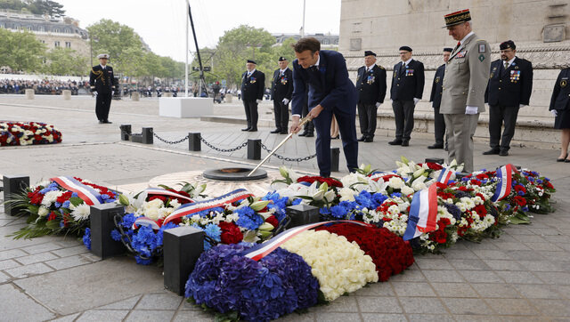 Paris’ traditional WWII commemorations began on the Champs-Elysees avenue, with the president laying a wreath at the statue of Charles de Gaulle, the wartime French resistance leader and later founding president of France’s Fifth Republic. AP