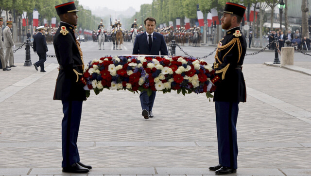 French President Emmanuel Macron stands in front of a wreath of flowers at the Tomb of the Unknown soldier during a ceremony under the Arc de Triomphe to mark the 77th anniversary of the end of World War II, 8 May, 2021, in Paris. AP