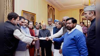Congress party President Sonia Gandhi, left, vice President Rahul Gandhi, center, and former Prime Minister Manmohan Singh, right, join Indian lawmakers from opposition parties to brief media after meeting Indian President Pranab Mukherjee to lodge their protest against the uncertainty prevailing after the government demonetizing high-value bills in New Delhi. AP