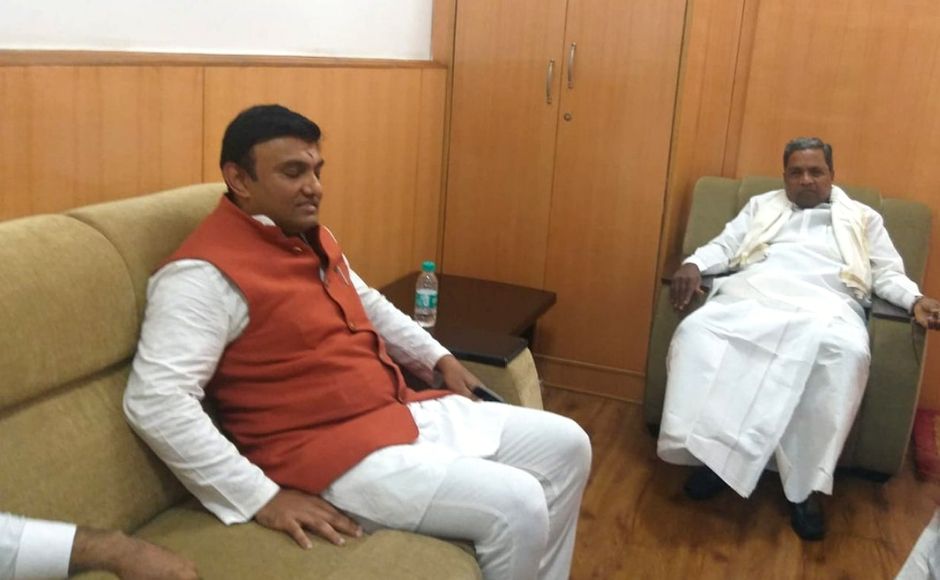 Senior Congress leader Siddaramaiah met MLA K Sudhakar, one of the two legislators who tendered their resignations on Wednesday. The BJP alleged that Congress ‘goons’ had assaulted and locked up Sudhakar, which the Congress refuted. Twitter/@ANI