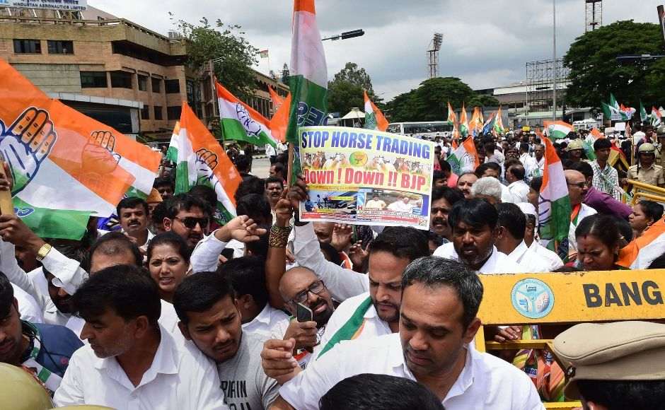 Congress held a protest against BJP in Bengaluru for alleged horse trading of Congress MLAs. With the two latest resignations, 16 MLAs — 13 from the Congress and 3 from the JD(S) — have quit, while two Independent MLAs — H Nagesh and R Shanker — have already withdrawn support to the government. PTI