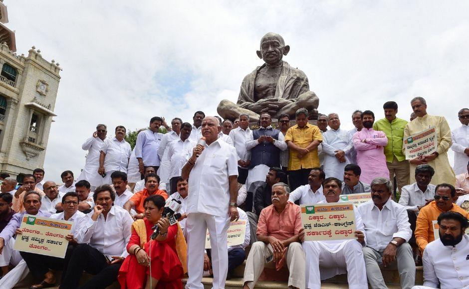 The BJP in Karnataka staged a ‘dharna’ at the Vidhana Soudha, demanding the resignation of Chief Minister HD Kumaraswamy. Later, state BJP chief BS Yeddyurappa also led BJP delegations to meet the governor and Speaker, demanding the dismissal of the coalition government. PTI