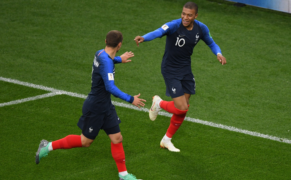 France’s forward Kylian Mbappe celebrates with teammate Antoine Griezmann. Mbappe scored the only goal of a match that ended with a 1-0 victory over Peru for France. AFP