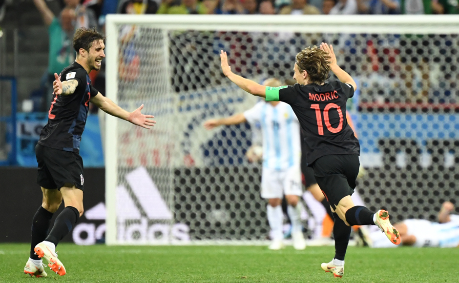 Croatian midfielder Luka Modric celebrates with defender Sime Vrsaljko after scoring the third goal of a 3-0 victory over Argentina. AFP