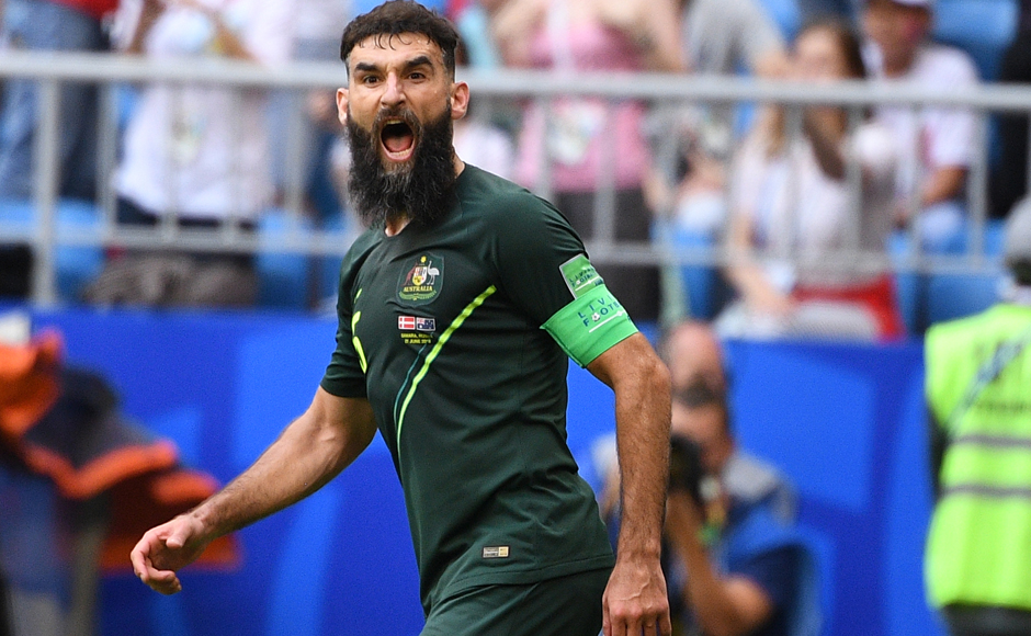 Captain Mile Jedinak celebrates scoring from the penalty spot for Australia’s equaliser, bringing the score up to 1-1. AFP