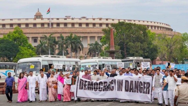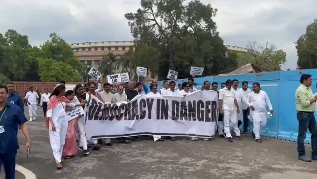 Holding a huge “democracy in danger” banner, opposition parties led by the Congress marched today towards the Rashtrapati Bhavan from Vijay Chowk. The substantial security presence was intended to prevent the leaders from reaching their destination, reported NDTV. Image Courtesy: @INCIndia/Twitter