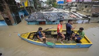 A family struggles to stay afloat in a house in the Nigambodh Ghat area, New Delhi. Not too far away is Delhi's oldest and busiest cremation ground, which might be forced to halt operations if the water level rises. AP