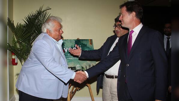 Deputy Prime Minister of England Nick Clegg shakes former Indian cricketer Farokh Engineer’s hand at the mahurat event of ‘Veda’ held at Taj Mahal Hotel in Mumbai
