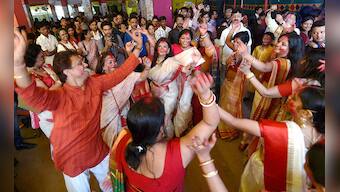 The Dashami rituals in the morning saw married women preparing the goddess and her children for their long journey back home by smearing the deities and each other with red vermilion. (Photo: PTI)