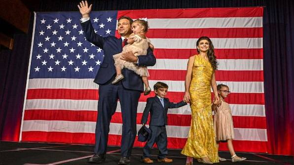Florida Governor Ron DeSantis with his family waves to supporters at an election night party in Tampa as he is projected to defeat Democratic challenger Charlie Crist to win a second term. Election night parties have been a long tradition followed in US politics and the midterms this year around was no different. AFP