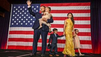 Florida Governor Ron DeSantis with his family waves to supporters at an election night party in Tampa as he is projected to defeat Democratic challenger Charlie Crist to win a second term. Election night parties have been a long tradition followed in US politics and the midterms this year around was no different. AFP