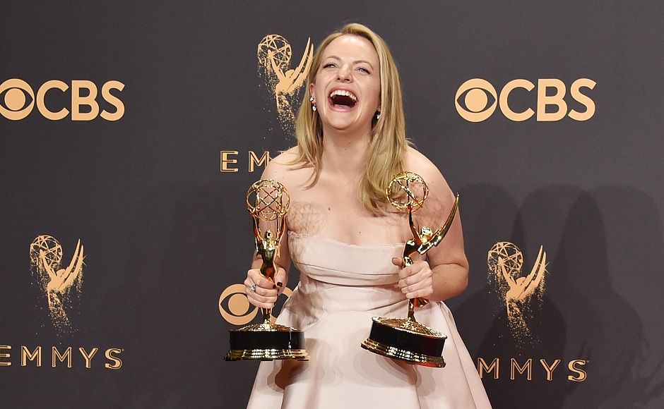A visibly elated Elisabeth Moss, winner of Outstanding Lead Actress in a Drama Series for The Handmaid’s Tale, poses for the cameras. Image from Getty Images.