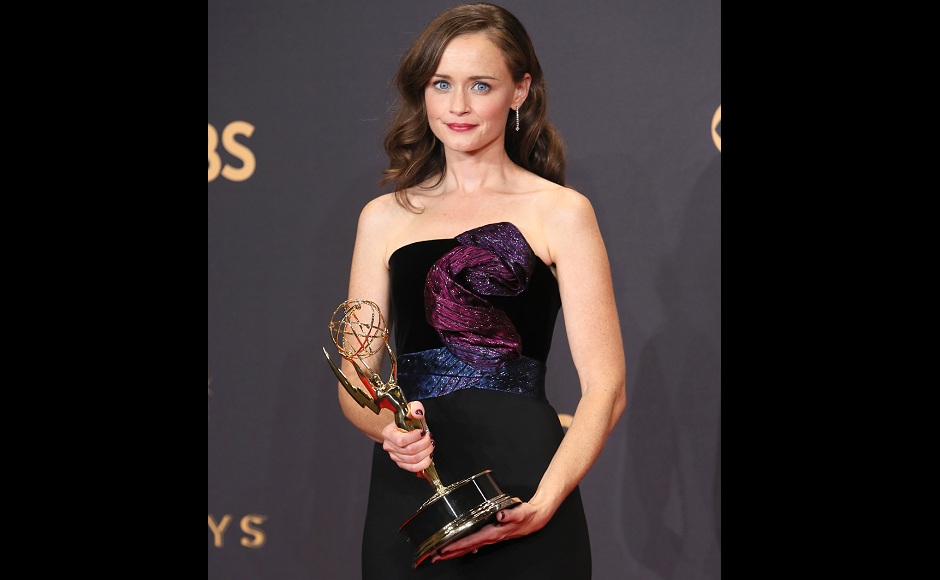 Alexis Bledel of The Handmaid’s Tale, winner of the award for Outstanding Drama Series, strikes a pose for the cameras. Image from Getty Images.