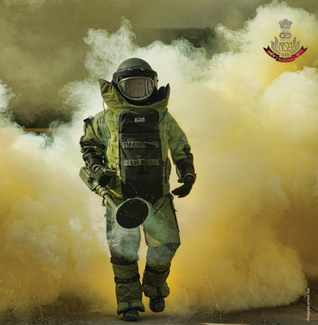 The fearless diffusers: A member of the bomb disposal team in his bomb suit. Image Courtesy: Pravin Talan