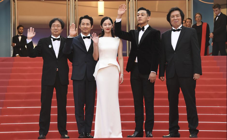 (From L-R) Producer Jun-dong Lee, actors Steven Yeun, Jong-seo Jeon, Ah-in Yoo, and director Chang-dong Lee pose for photographers upon arrival at the premiere of the film Burning at Cannes. Photo by Arthur Mola/Invision/AP