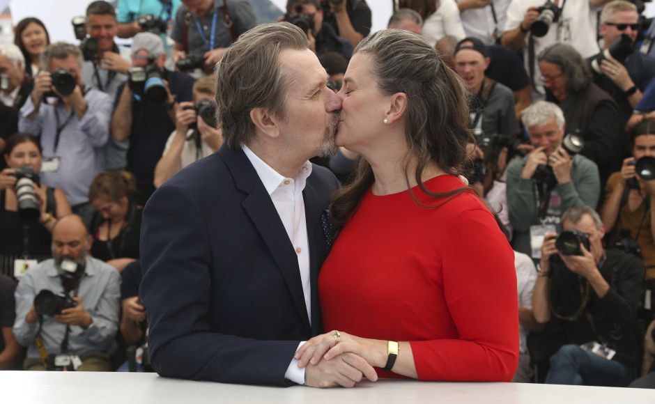 Gary Oldman (L) kisses his wife Gisele Schmidt during a photo call at the 71st international film festival, Cannes. Photo by Joel C Ryan/Invision/AP