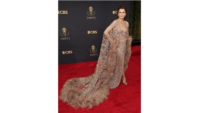 Keri Russell dressed all the way up in a Zuhair Murad couture gown in rose mauve with feathers surrounding the hem of a caped back (AP photo)