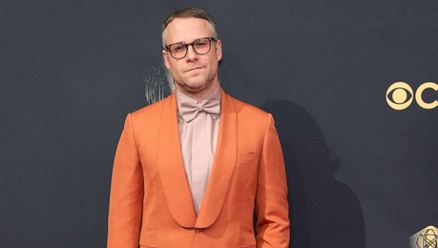 Seth Rogen turned heads in an orange tuxedo jacket and brown trousers (Rich Fury/Getty Images)