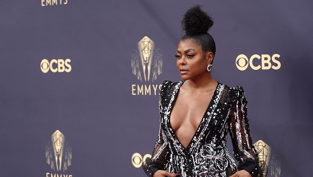 Taraji P. Henson in a black and white sequin embroidered tulle look by Elie Saab, her hair in a top knot at the Emmy Awards red carpet (AP Photo)