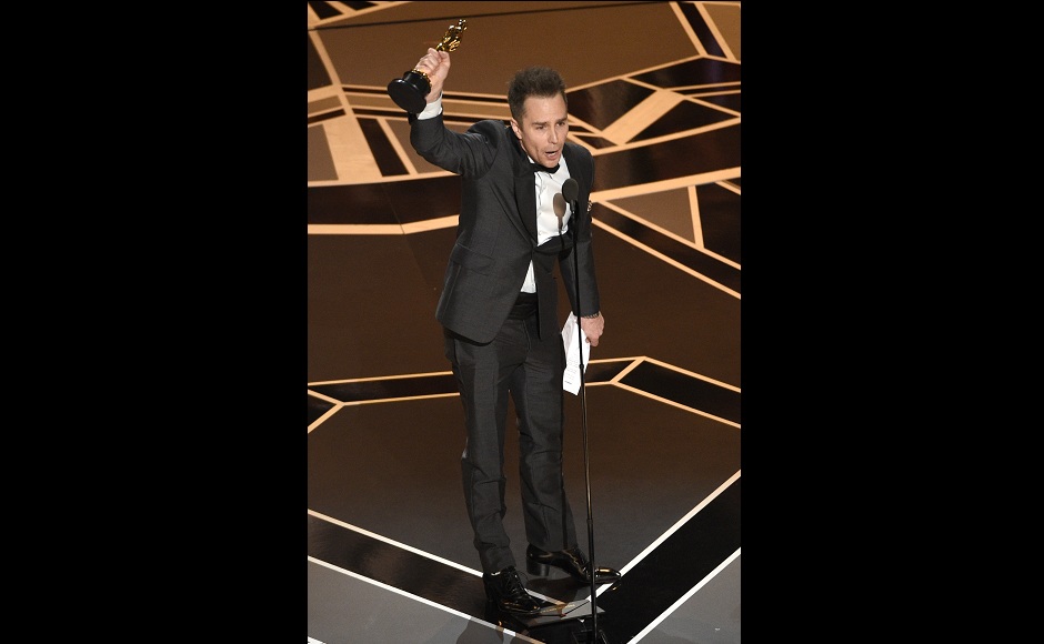 Sam Rockwell accepts the award for best performance by an actor in a supporting role for Three Billboards Outside Ebbing, Missouri at the Oscars on Sunday, 4 March, 2018, at the Dolby Theatre in Los Angeles. AP/Chris Pizzello