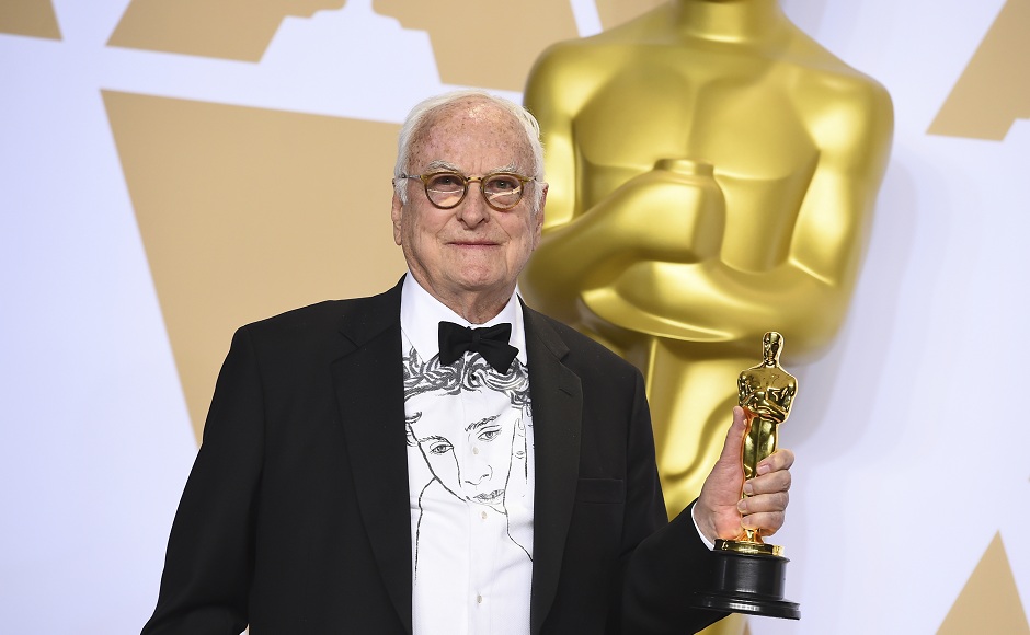 James Ivory, winner of the award for best adapted screenplay for Call Me by Your Name, poses in the press room at the Oscars on Sunday, 4 March, 2018, at the Dolby Theatre in Los Angeles. AP/Jordan Strauss