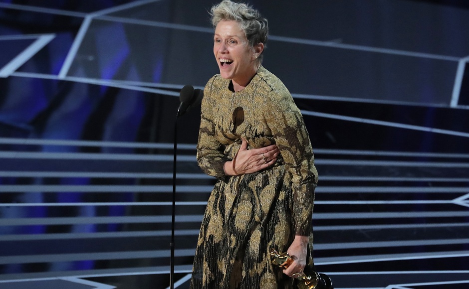 Frances McDormand accepts the award for best performance by an actress in a leading role for Three Billboards Outside Ebbing, Missouri as Jennifer Lawrence and Jodie Foster look on from right at the Oscars. AP/ Chris Pizzello