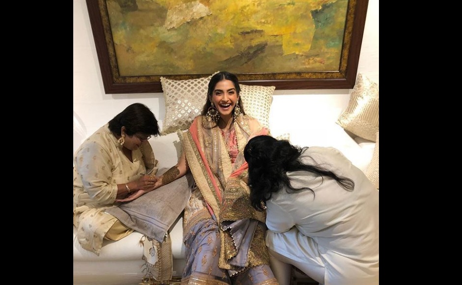Rhea Kapoor, sister of the bride, getting her hands henna-ed on the night of the mehendi on Day 1. Image from Instagram/@rheakapoor