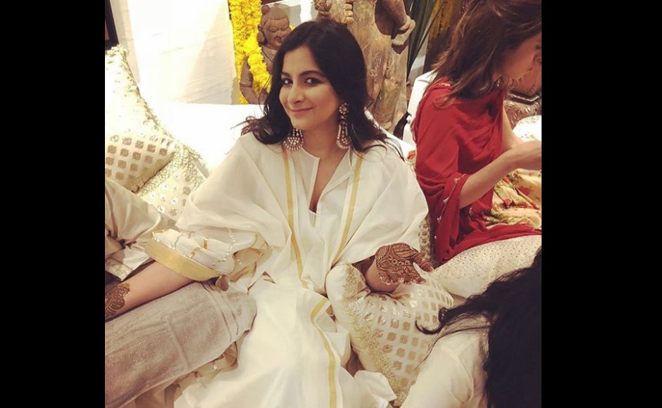 For the second day, which is booked for an extended mehndi cum pre-sangeet ceremony, Sonam Kapoor wears an ethereal white and gold lehenga. Image from Instagram/@anaitashroffadjania