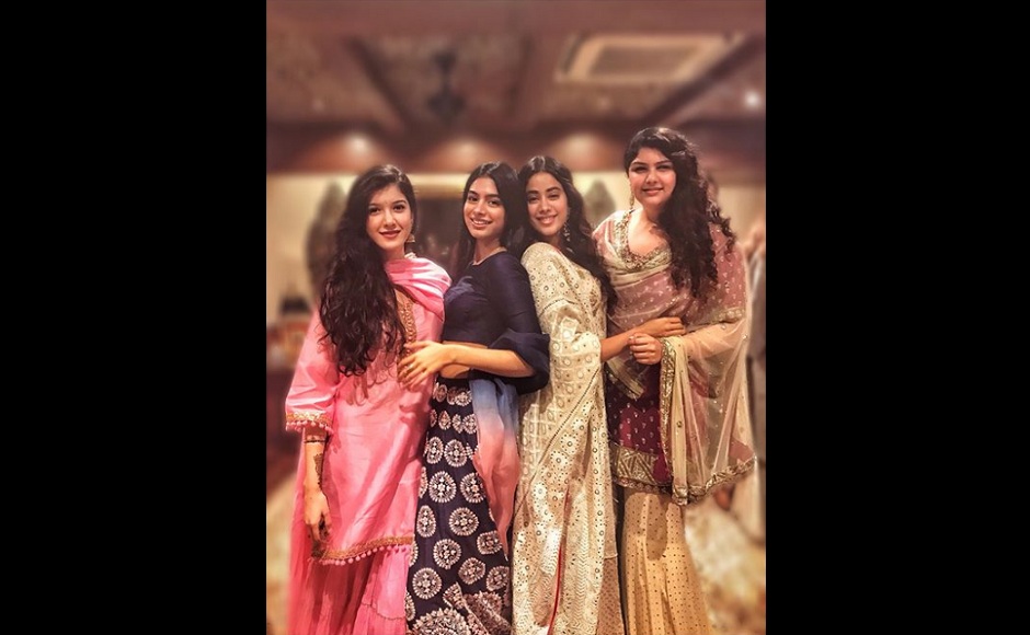 Shanaya Kapoor, Khushi Kapoor, Janhvi Kapoor and Anshula Kapoor pose at the mehndi night. Image from Instagram/@anshulakapoor