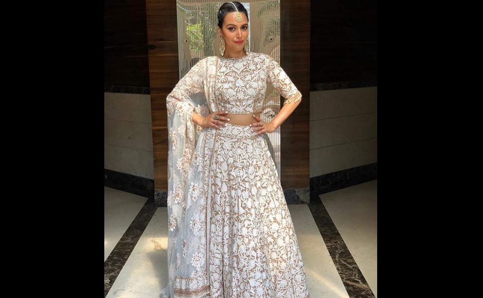 Swara Bhasker sports a white and gold lehenga on Day 2 of the wedding celebrations. Image from Instagram/@sonamkishaadi