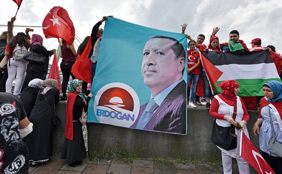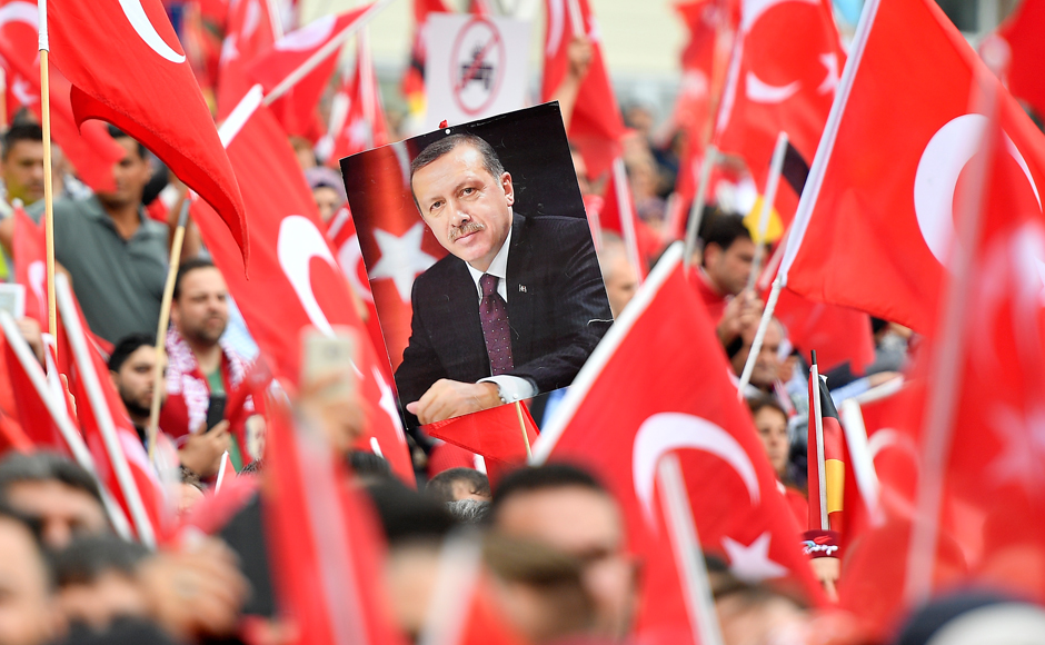 A picture of Turkish president Erdogan is framed by national flags during the demonstration in Cologne. Organisers at the rally played the Turkish and German national anthems and held a minute of silence for the people killed in the attempted coup. The slogan of the demonstration was “Yes to democracy. No to the coup.” AP