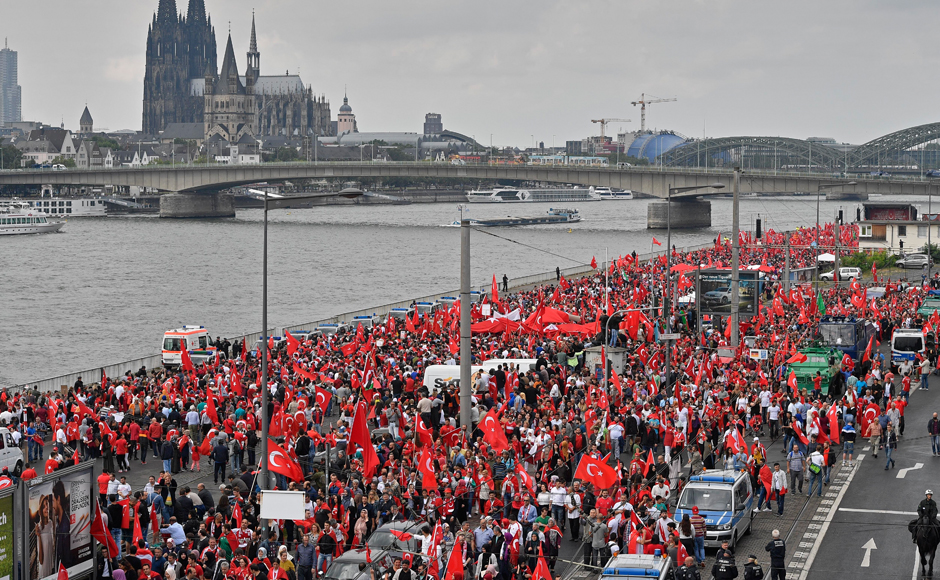 Turkish protesters demonstrate in Cologne, Germany on Sunday. Thousands of supporters of Turkish President Recep Tayyip Erdogan gathered for a demonstration against the failed 15 July coup in Turkey. AP