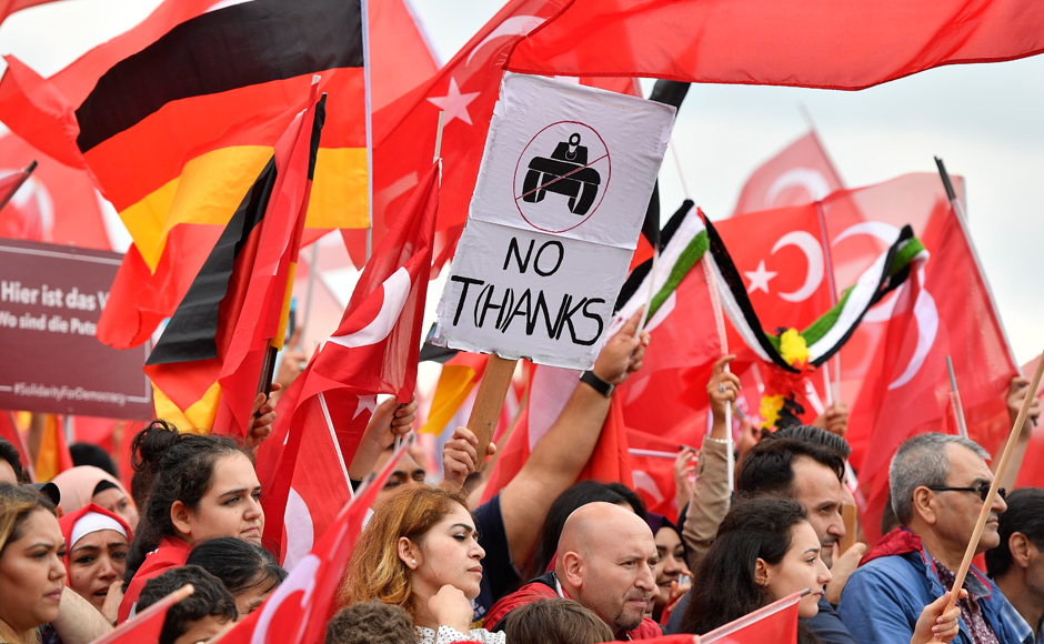 A heavy police presence protected demonstrators. Police estimated that between 30,000 to 40,000 people demonstrated peacefully at the riverside rally, across the Rhine from downtown Cologne. Many waved Turkish flags. Germany is home to roughly three million people with Turkish roots. AP